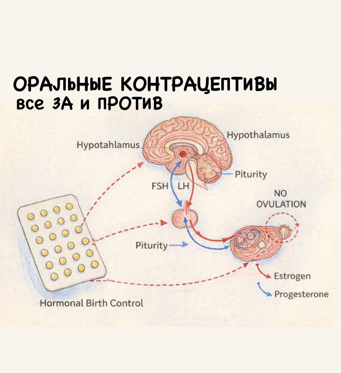 ) КОК - это группа препаратов, содержащих синтетические аналоги половых гормонов (этинилэстрадиол и прогестин левоноргестрел), цель которых предупреждение нежелательной беременности. По своей сути все комбинированные противозачаточные таблетки одинаковы. Друг от друга они отличаются количеством и периодом приёма эстрогена, типом прогестина, а также названием. На самом деле, к КОК НЕ существует иных показаний, кроме контрацепции. Во всех остальных случаях (акне, гирсутизм, эндометриоз (НЕ путать препарат Визанна, часто назначаемый при эндометриозе, с КОК!) и т.д.) мы просто «закрываем глаза» на проблему, принимая КОК. Что ещё ХУЖЕ, так это то, что КОК часто назначаются без дополнительных обследований и учёта всех имеющихся противопоказаний, а ещё хуже САМОназначаются! Механизм действия КОК КОК блокируют работу гипоталамо-гипофизарной системы за счёт механизма отрицательной обратной связи и прямого блока рилизинг-факторов гипоталамуса и гормонов гипофиза. Таким образом, КОК: ∙ Повы