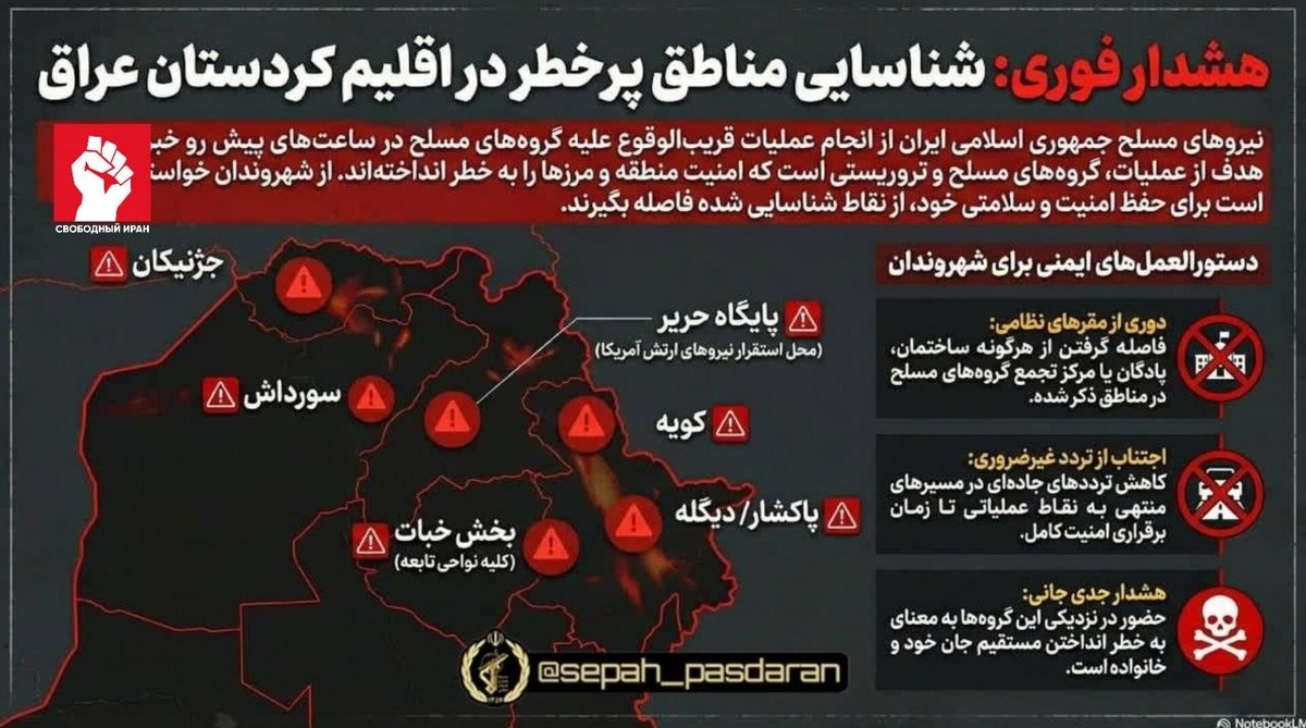 🚨 Иран разослал уведомление жителям Иракского Курдистана с призывом держаться подальше от районов, где, как утверждается, находятся штаб-квартиры террористических группировок. По данным сообщения, операции в этих местах могут начаться в ближайшие часы. Подпишитесь на канал