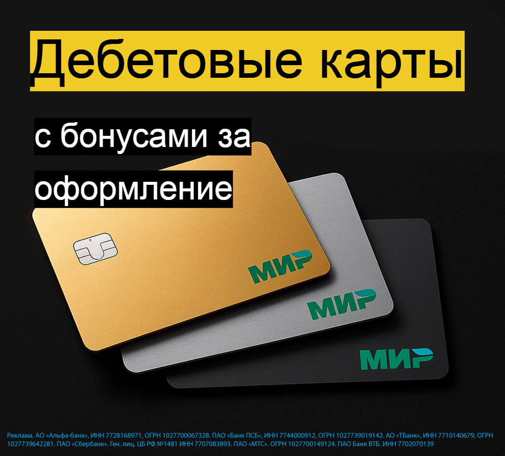 Пока власти резко не ограничили выдачу банковских карт до 20 штук на руки, спешим получать дебетовые и кредитные карты с хорошими условиями и бонусами В основном акции для новых клиентов или тех, у кого не было карт больше года. Газпромбанк — дебетовая карта «Мир» — бонус до 2 500 руб. Бонусы: сертификат на 1 500 руб. в Золотое Яблоко, Лента, Озон или WB. и дополнительный кэшбэк 100% в супермаркеты (до 1000 б). • Условие: покупка от 1000 в течение 30 дней после активации. ПСБ — дебетовая карта «Твой кэшбек» — бонус 2 500 руб. Бонусы: сертификат на 1 500 руб. в WB, Золотое Яблоко, Магнит или Озон и кэшбэк 25% на все покупки (до 1 000 руб.). • Условие: покупка от 1 000 в течение 90 дней после активации.