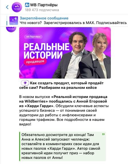 » WB выкатили подкаст с очередной историей успеха. Селлер - Анна Егорова. По совместительству — сопредседатель по работе с селлерами АУРЭК. Той самой ассоциации, которая вроде как должна отстаивать интересы продавцов в диалоге с маркетплейсами. Интересная конфигурация получается. Если у вас плохо прогружаются файлы, все посты также доступны в MAX: https://max.ru/marketplace_biz