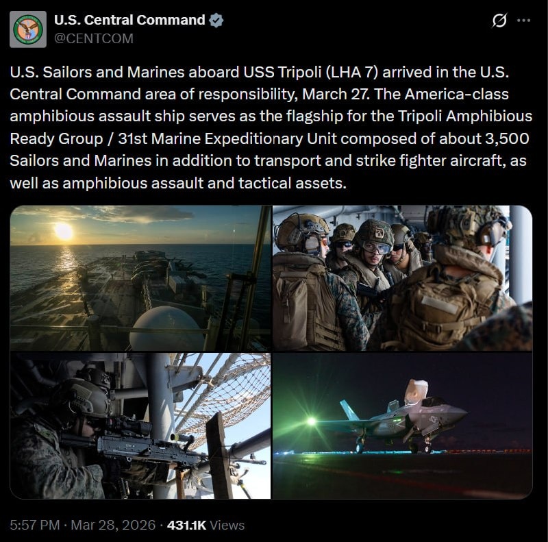 командования США на Ближнем Востоке. О переброске сообщил CENTCOM. Как уточнили в командовании, USS Tripoli класса America действует в качестве флагмана десантной группы Tripoli / 31-го экспедиционного подразделения морской пехоты. В её составе — около 3,5 тысячи моряков и морских пехотинцев, а также транспортные и ударные истребители, десантные и тактические средства. Таким образом, в регион прибыла не отдельная партия личного состава, а полноценная морская десантно-ударная группировка с возможностями для быстрой проекции силы, переброски подразделений и поддержки операций с моря и воздуха. Факт прибытия USS Tripoli подтверждает ранее озвученные Вашингтоном планы по усилению военного присутствия США на Ближнем Востоке. 🟪Читай в Max | 🚀Читай в Telegram | 🥰Смотри на RUTUBE