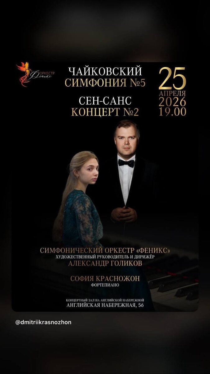 СОФИЯ КРАСНОЖОН — ВЕЧЕР В САНКТ-ПЕТЕРБУРГЕ Ценителей фортепианного искусства ждёт редкая встреча. 25 апреля 2026 года на Английской набережной — сольный вечер яркой российской пианистки, имя которой уже называют в ряду лучших интерпретаторов романтической музыки. София Красножон (фортепиано) исполнит виртуозный Концерт №2 для фортепиано с оркестром Сен-Санса — жемчужину, где блеск и лирика переплетаются с подлинно симфоническим размахом. В этот вечер Софии будет аккомпанировать Симфонический оркестр «Феникс» под управлением Александра Голикова. Вторая часть программы — Симфония №5 Чайковского — станет достойным обрамлением главного события вечера: выступления Софии Красножон. 📍 Где: Санкт-Петербург, Концертный зал на Английской набережной 🕒 Когда: 25 апреля 2026 (суббота), 19:00 Бесплатно получить ваш билет вы можете по телефону: 📞 +7 (921) 946-87-24 (Наталия) Количество мест в зале ограничено. Успейте забронировать — этот вечер обещает стать событием сезона.