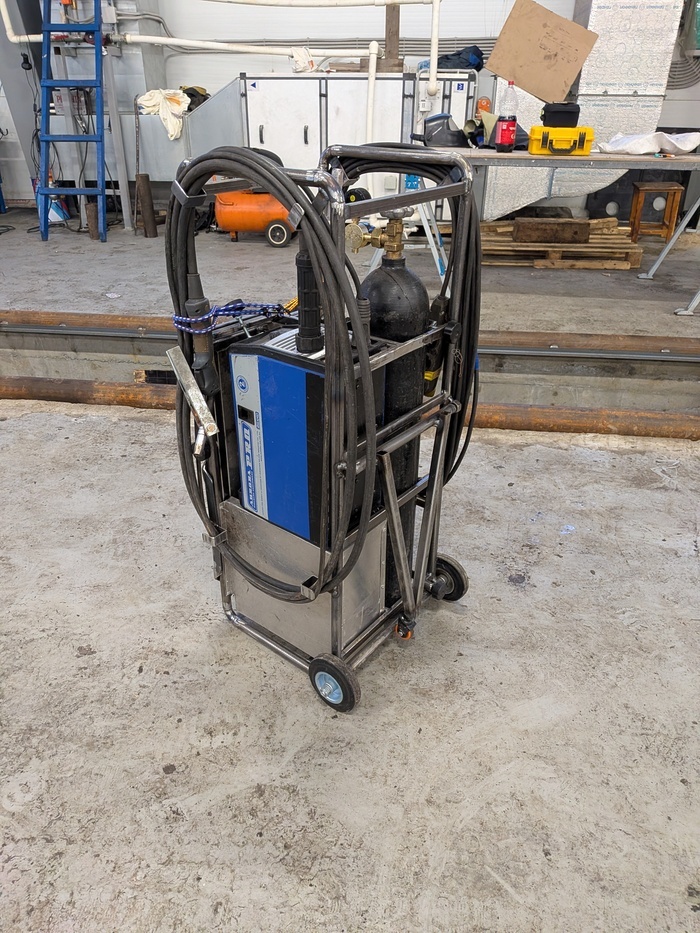 Сделал телегу для полуавтомата, для работы на выезде. Тележка из 1/2 трубы и профиля 20*10/20*1, 5. В вертикальном положении занимает место 40*45 см и 100см высоты. В рабочее положение переводится наклоном на откидную опору с поворотным колесом, угол примерно 30 градусов. Имеется подъёмный столик с выдвижным ящиком. Под столиком, за аппаратом, ящик в который убирается кабель питания и две ушмки на 125 мм. Испытания показали очень хорошую маневренность и устойчивость. Ящик удобный, внутренний размер 15*16*50 см. Необходимо заменить колесо откидной опоры на больший диаметр, хотя бы 80 мм, так как маленькое колесо запинается даже о кабель удлинителя, не говоря уже о стыках брусчатки и плит. Заменить колесо и можно красить. Пост автора romarez. Читать комментарии на Пикабу.