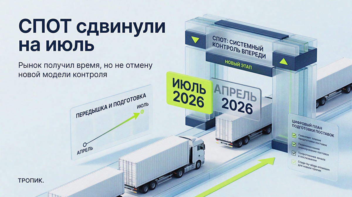 Рынок ждал, что СПОТ начнет заходить в практику уже с 1 апреля. Теперь срок сместили, и тестовый запуск ожидается с 1 июля 2026 года. Для импортеров, перевозчиков и тех, кто возит товар через ЕАЭС автотранспортом, это выглядит как небольшая передышка. Но важно правильно понять смысл этой новости: систему не убрали и не отменили, рынок просто получил дополнительное время до старта новой модели контроля.