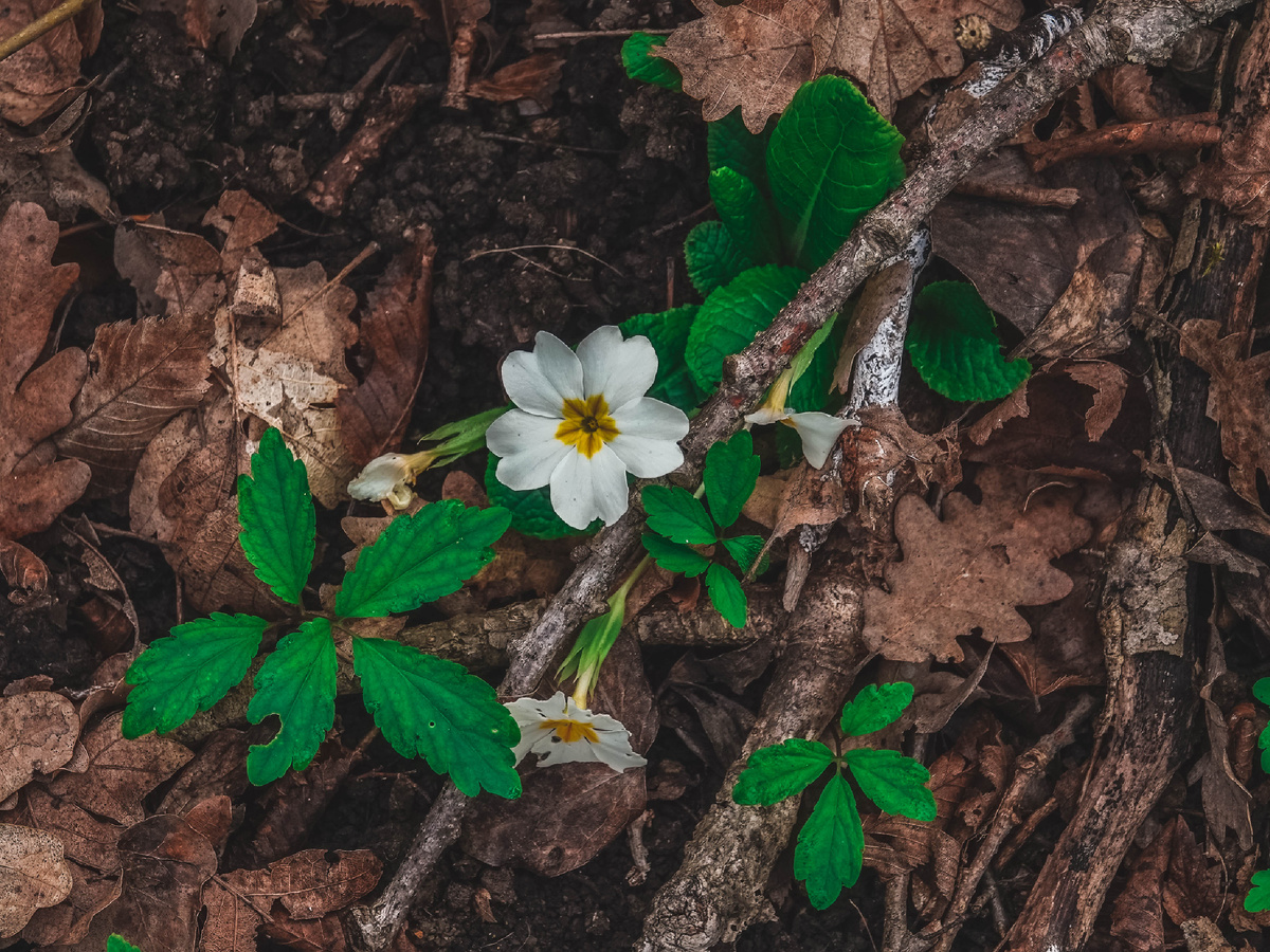 Цветут примула и зубянка пятилистная.