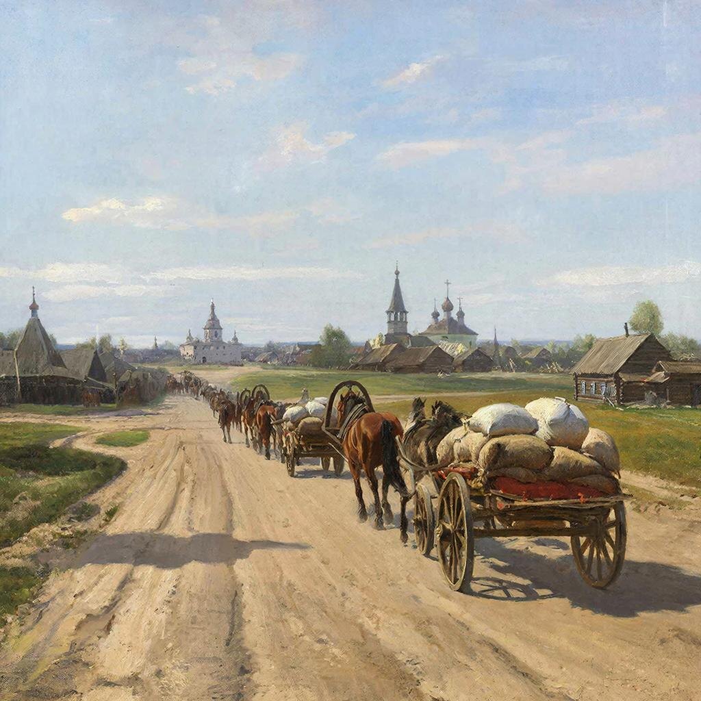 Описание: Деревня. По дороге через деревню идет обоз из нескольких телег. Знойное лето. Время сбора урожая.