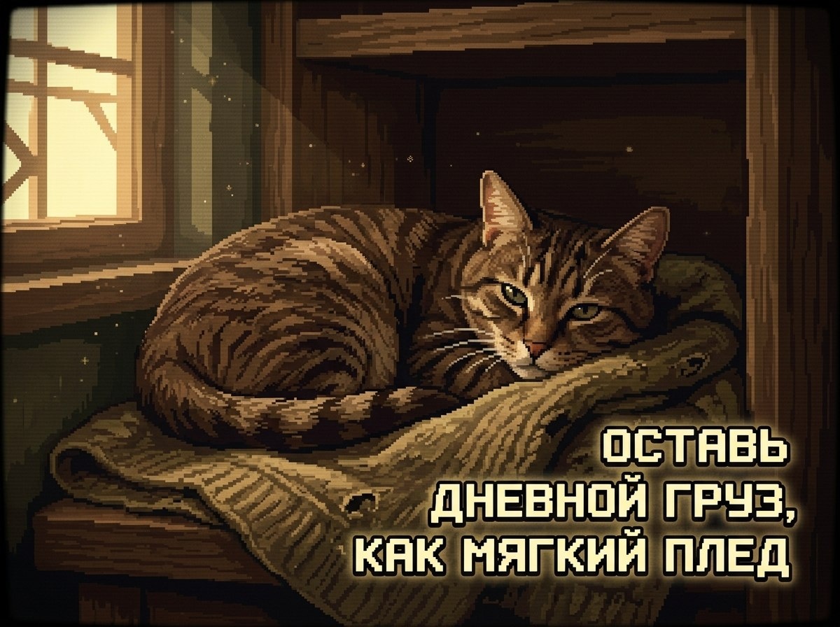 Послушай: вечер создан, чтобы снимать с плеч дневной груз, как мягкий плед. Всё, что сегодня не получилось, может отдохнуть до завтра. Ты сделал(а) достаточно для этого дня, а остальное бережно доспит вместе с ночью. Посмотри внутрь себя, как я всматриваюсь в тёплый полумрак комнаты: там горит маленький, но упрямый свет твоей души. Ты умеешь заботиться, мечтать, ошибаться и подниматься снова. Сейчас мир вокруг мягко стихает, чтобы подарить тебе покой. Доверься этой тишине — я, кот-страж ночи, остаюсь рядом в твоём воображении и охраняю твой сон. Ты в безопасности. Можно закрыть глаза и смело плыть навстречу добрым снам.