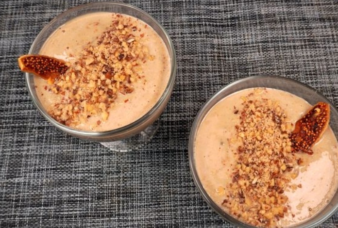 Орехи грецкие (для подачи) - 40 г Молоко доводим до кипения, снимаем с огня и охлаждаем примерно до 50 ℃. Инжир тщательно промываем и удаляем плодоножки. Нарезаем инжир кусочками и отправляем в чашу блендера. Измельчаем инжир до однородной густой массы. Добавляем инжирную массу к остывшему молоку (для начала лучше взять 1/4 часть молока). Пробиваем блендером, постепенно, небольшими порциями вводя оставшееся молоко, каждый раз добиваясь полной однородности. Орехи всыпаем в чашу блендера. Измельчаем в крошку. Разливаем массу по креманкам и убира