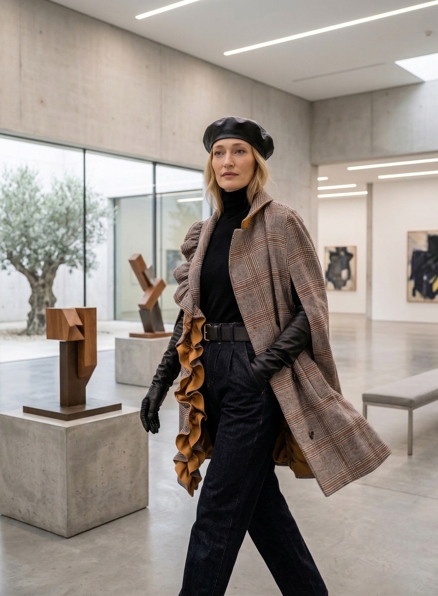 Работает это так: жёсткая фактура берета «собирает» верхнюю часть образа, визуально приподнимая линию плеч и создавая опору для лица. А мягкие переходы в одежде — например, трикотажная водолазка под пальто — балансируют композицию, не давая образу стать слишком «тяжёлым».