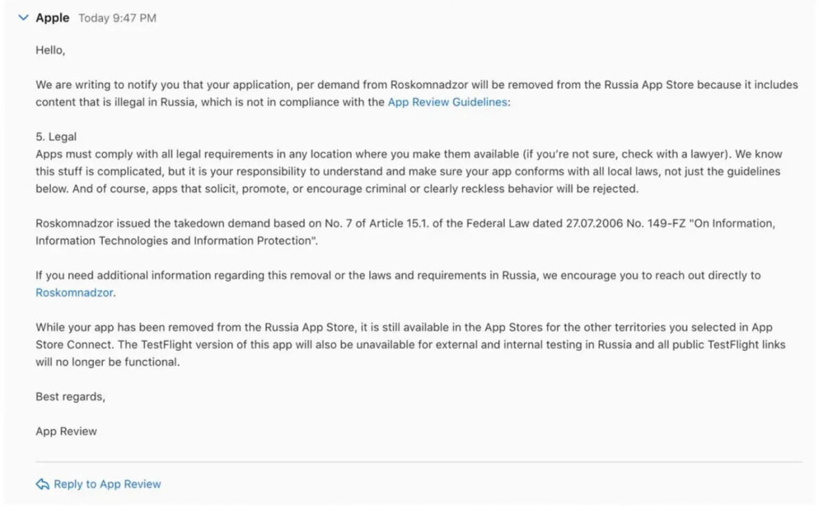 Из российского сегмента App Store пропали популярные прокси-утилиты и VPN-сервисы. Под блокировку попали приложения Streisand, V2Box, v2RayTun и Happ - Proxy Utility. В других регионах программы все еще доступны. Те, кто успел установить софт раньше, смогут им пользоваться, но больше не будут получать обновления через российский аккаунт. Разработчики v2RayTun опубликовали письмо от Apple, которое подтверждает: приложения скрыли по требованию Роскомнадзора. Регулятор сослался на закон «Об информации» и наличие в программах «незаконного контента». ➡️В Google Play аналогичный софт все еще доступен без ограничений. @setters_media