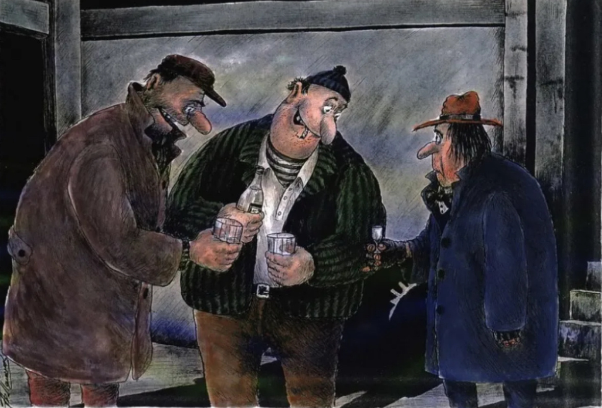 Раннее воскресное утро. Из баржана выходят двое, вынимают из карманов бутылку водки, стакан и одну маслину, и ставят это все на камень. Присели рядом, оглянулись. Видят, идет Шая.