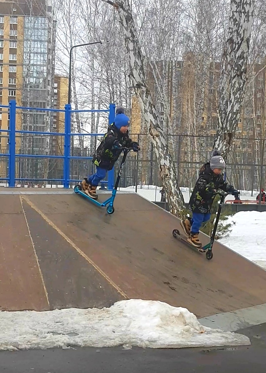 Мы дошли до горок, думала будем первооткрывателями самокатного сезона, а там уже вовсю рассекали мальчишки лет десяти.