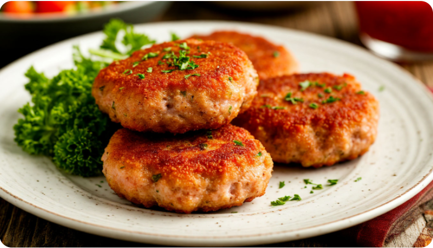 Котлеты с желатином внутри получаются очень сочными. Чтобы сок не вытекал наружу через трещинки в корочке, используйте двойную панировку: сначала мука, затем яйцо (льезон), потом сухари. Это создает герметичную оболочку.