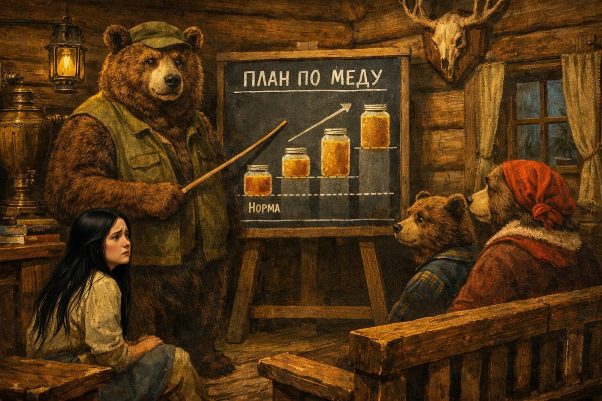 За столом сидел медведь. Перед ним висела доска с таблицей. "ПЛАН НА ДЕНЬ": Сбор ягод - 12 кг. Медовая переработка - 8 единиц. Воспитательная работа - 1 беседа. Самокритика - по необходимости. Рядом висела ещё одна доска, чёрная. С надписью: "ДОСКА ПОЗОРА".
