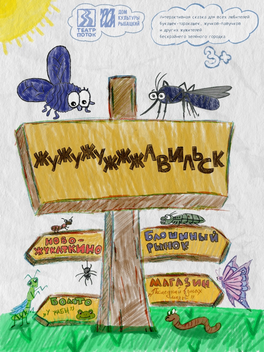 » 🐛Вы когда-нибудь слышали о маленьком, но очень населённом городке Жу-жу-жу-жжжавильске? Нет?! Тогда мы вам откроем большой секрет. 🦟В этом городе живут как обычно. Ходят в школу и на работу. Стоят в пробках. Опаздывают и спешат куда-то туда, где они очень нужны. В этом городе есть всё: торговые центры, банки и поликлиники. Есть ЖК и парковки, есть магазины, музеи и театры. И живут там как обычно, но только не люди, а всевозможные насекомые. И они, как ни странно, тоже погружены в ту самую рутину. Из которой очень сложно выбраться. 🐞Но всё меняется в миг, когда в Жу-жу-жу-жжжавильск прибывает из другого маленького городка совсем юная Муха-Желтобрюха, которая очень хочет найти своё место в большом городе, обрести друзей и обзавестись какой-нибудь заветной мечтой, к которой она, маша крылышками, будет стремиться. Её поиски превращаются в настоящее приключение, которое переворачивает с лапок на лапки обычную жизнь этого славного городка. 🦋Именно за этими приключениями Театр «ПОТО