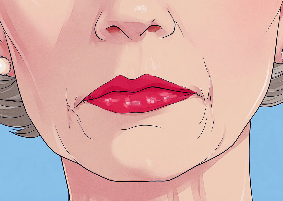 - Ослабление лицевого каркаса. Связки, которые удерживают мягкие ткани лица, постепенно растягиваются и теряют упругость. Жировые пакеты смещаются вниз под действием гравитации и начинают давить на зону уголков губ. В результате уже имеющиеся складки углубляются, а над ними формируются характерные «валики».