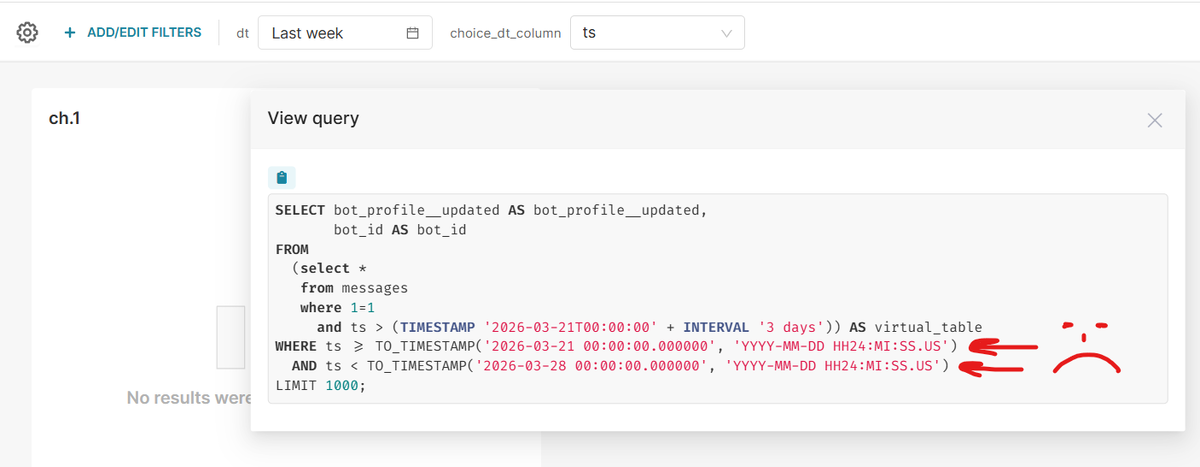 В этой статье продолжаем борьбу с фильтрами по дате в Apache Superset. Сегодня разберем, как реализовать подобие логики remove_filter в старых версиях (до 5), чтобы виртуальный датасет не оборачивался фильтрами. Обязательно прочитайте первую часть, чтобы понимать, откуда взялись на дашборде фильтры и почему они именно такие. Довольно часто мы используем виртуальные датасеты. И порой бывает нужда как-то покастомить ту дату, которую передают фильтры. Давайте же сразу наиграем такой кейс: select * from messages where 1=1 and ts > (TIMESTAMP '{{ from_dttm | default("1970-01-01", true) }}' + INTERVAL '3 days') Нам, например, крайне важно к той дате, которую пользователь передал в фильтре, добавлять еще 3 дня. Ну и видим боль - виртуальный датасет сверху все равно оборачивается условиями из фильтра. И это не никак не отменить, в отличие от других макросов, где есть параметр remove_filter. Можно привести целую массу кейсов, почему это плохо. В нашем случае - фильтрация будет работать неверно