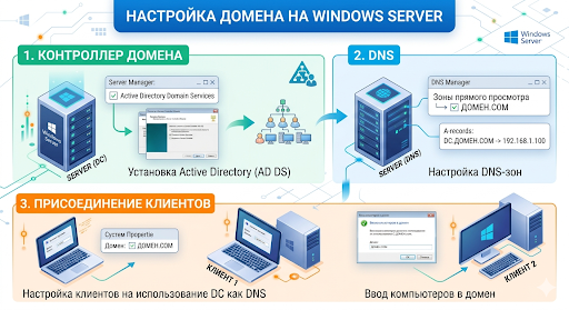 В небольшом офисе каждый компьютер живёт своей жизнью: у всех свои пароли на стикерах, общие папки открыты для всех, а нового сотрудника встречает админ с флешкой, обходящим все машины. Рано или поздно этот хаос перестаёт работать. Выход — домен Active Directory. Один сервер (контроллер домена) хранит учётные записи всех пользователей, управляет доступом и раздаёт политики. Клиенты входят в домен и получают единый вход. Как развернуть за час. 1. Подготовка сервера. Статический IP, понятное имя, обновления. 2. Установка ролей. В Диспетчере серверов добавляем AD DS и DNS (они неразлучны). 3. Повышение до контроллера. Создаём новый лес с именем (например, company.local). Задаём пароль DSRM, проходим мастер — сервер перезагрузится и станет контроллером. 4. Проверка. После перезагрузки заходим как администратор домена. Выполняем nslookup company.local — должен вернуться IP сервера. 5. Создание пользователей. В оснастке «Пользователи и компьютеры Active Directory» добавляем тестовую учётку.