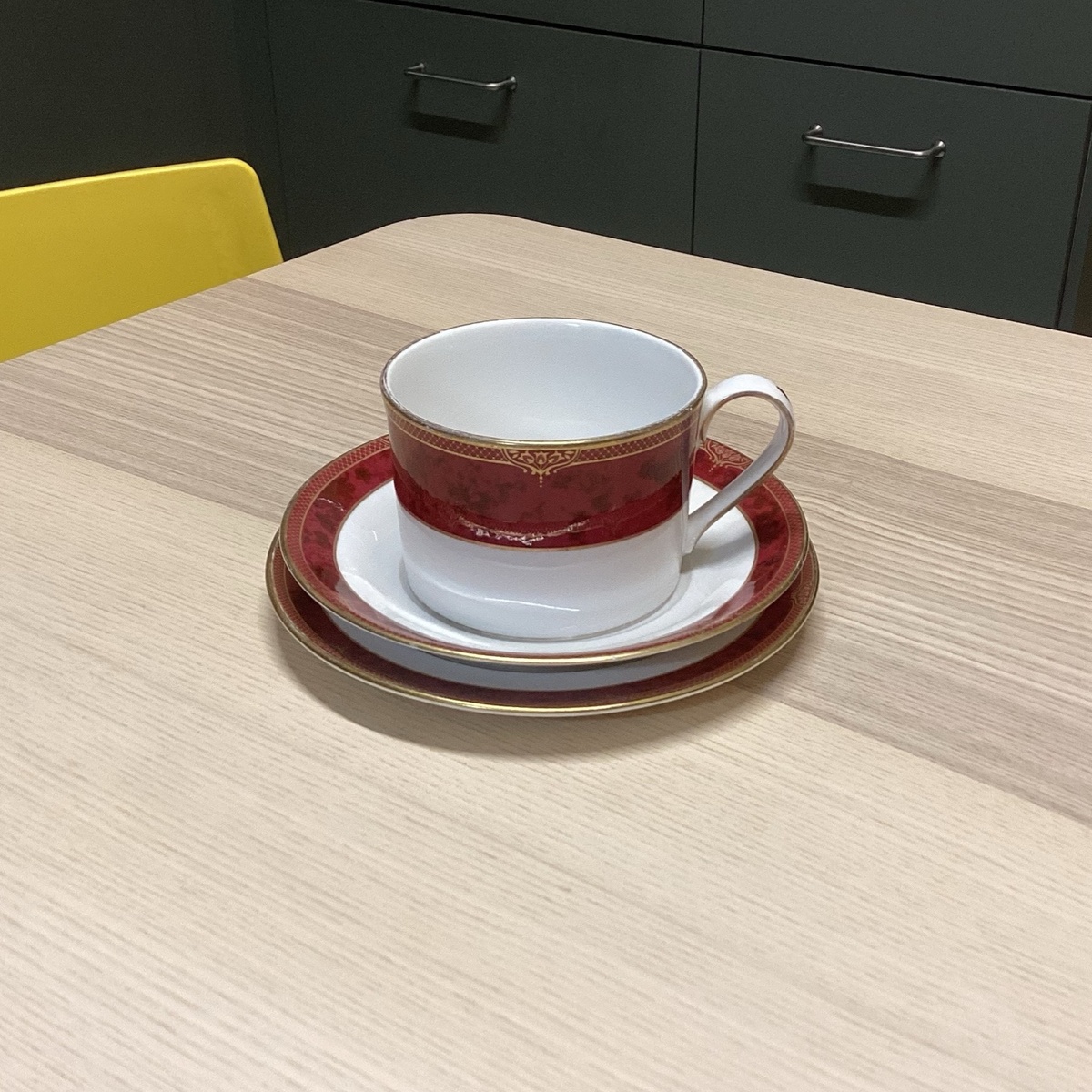 Это комплект от английской фабрики "Spode", которая первая придумала костяной фарфор ещё в 18 веке. Серия называется "Bordeaux". На фотографии кажется, что на крытье есть потёртости, но это белые блики. Очень интересный мраморный эффект, красный с темно-бордовым