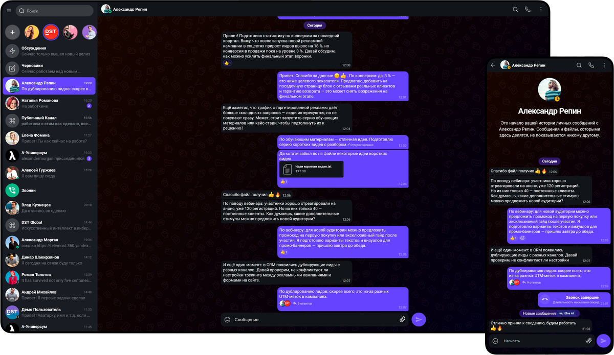 Да, интерфейс знаком и удобен — мы сознательно сделали его похожим на Telegram, чтобы ваши сотрудники, партнёры или участники сообщества начинали работу без обучения. Но за внешней простотой скрывается принципиально иной уровень возможностей.