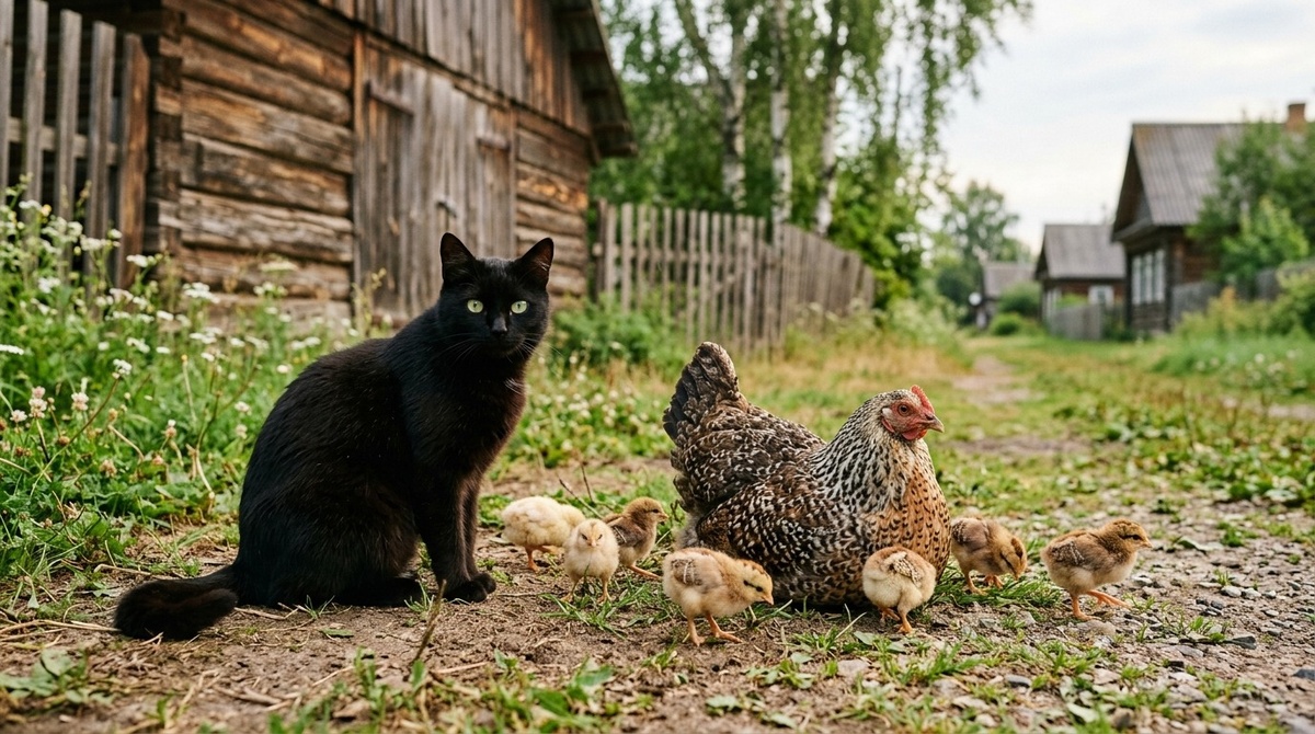 Когда цыплята вывелись – маленькие, пушистые, на тонких дрожащих ногах – Цыган остался. Он не трогал их, не нюхал слишком пристально, не проявлял того острого интереса, который бывает у кошек к мелкому живому. Лежал чуть поодаль, пока Розочка водила выводок по двору, учила клевать, собирала птенцов под крыло при первом облаке.