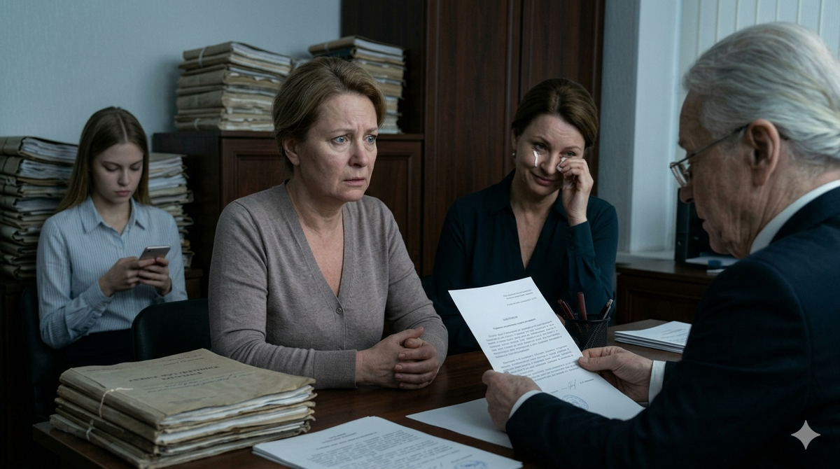 В офисе собрались все. Марина прилетела первым рейсом, вся в черном, картинно прикладывала платочек к глазам. Внучка Леночка сидела в телефоне, выбирая, кажется, новую модель авто.