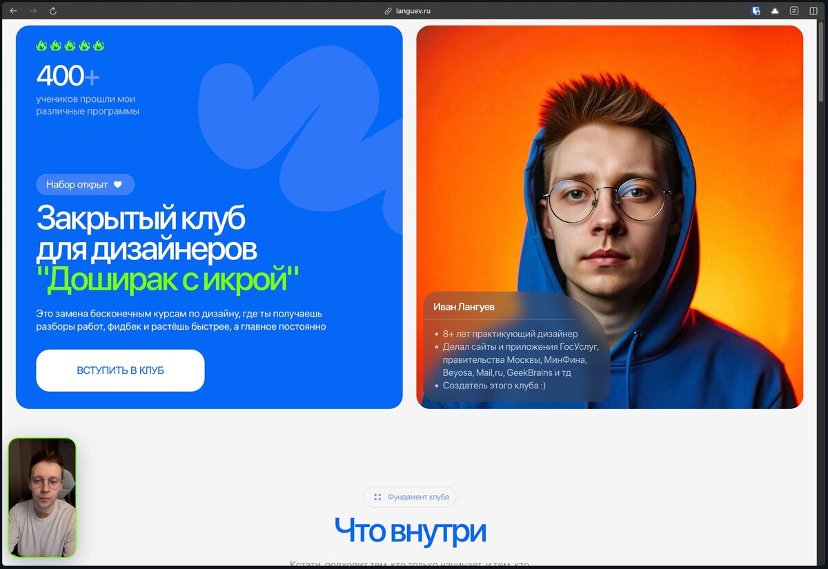 Собрал сайт клуба 👀 Больше делал не просто ради сделать сайт, а чтобы нормально упаковать саму идею • что это вообще за клуб • как он работает • и зачем туда идти Потому что словами в постах всё равно не до конца передаётся В итоге получилась такая штука, где можно спокойно всё посмотреть и понять — как устроен клуб изнутри — подойдёт ли тебе вообще (ответы на частые вопросы) — нужен ли он тебе сейчас (для кого подходит) — и посмотреть приветственный видосик от меня *сайт не в финальной своей версии, буду его регулярно докручивать и добавлять нвоые блоки 🔗 Ссылочка: https://languev.ru/club Если посмотришь сайт — напиши мне @languev, как тебе: понятно / не понятно / откликается / нет и тд Интересно, насколько получилось донести идею ⚡️