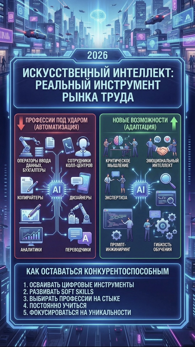 Искусственный интеллект не уничтожает профессии, а трансформирует их. В 2026 году выиграют те, кто воспринимает ИИ как партнёра, а не конкурента, и готов инвестировать в собственное развитие.