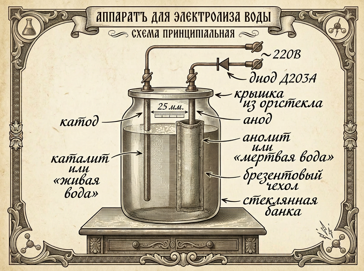 В девяностые годы в очень многих квартирах тихо жужжал самодельный ионизатор воды. Банка из-под огурцов, два электрода, брезентовый мешочек — и пожалуйста: «живая» и «мёртвая» вода прямо из-под крана. Пей, полоскай горло, лей на раны, а по народным поверьям — даже рак должен был отступить. Устройства паяли по схемам из «Техники — молодёжи» и «Моделиста-конструктора». Эти схемы перерисовывали от руки, передавали соседям и бережно хранили в папках с надписью «Полезное». Бабушки заваривали на «живой» воде чай, а продавцы на рынках обещали здоровье из обычной розетки. Электролиз действительно работает. Но чудес, как водится, не творит. Принцип был до смешного прост. Два электрода опускали в водопроводную воду. Один — в плотный тканевый мешочек. Подавали постоянный ток. Через 20–40 минут у анода получалась кислая «мёртвая» вода (анолит), у катода — щелочная «живая» вода (католит). Мешочек не давал им сразу смешаться. У анода выделялся кислород и немного хлора — вода становилась кислой и при