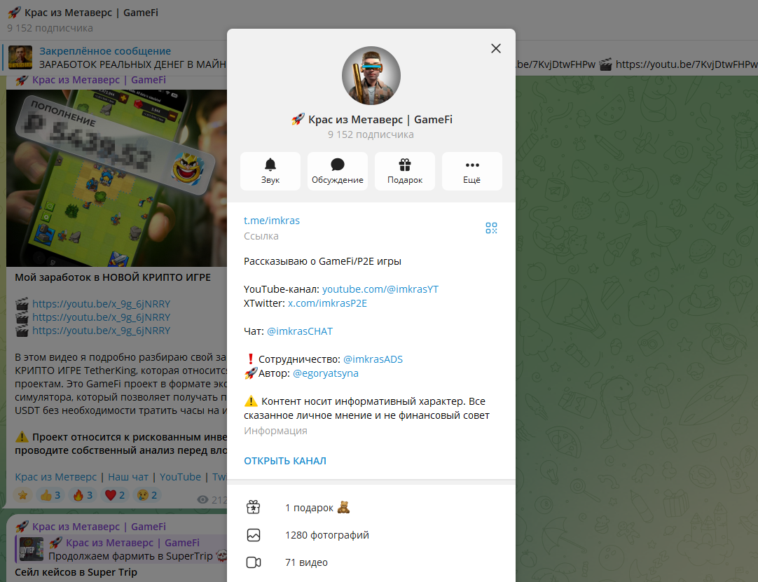 Если честно, сначала канал выглядит вполне безобидно. Типа парень рассказывает про GameFi, P2E-игры, как зарабатывать в крипте, кидает гайды, видео с YouTube — вроде всё ок. Но если чуть внимательнее посмотреть, становится понятно: это не про реальный заработок, а про прогрев аудитории под разные проекты. Если не хотите тратить время на такие «заработки в играх», лучше сразу глянуть более адекватные варианты. По описанию всё красиво: • GameFi и криптоигры
