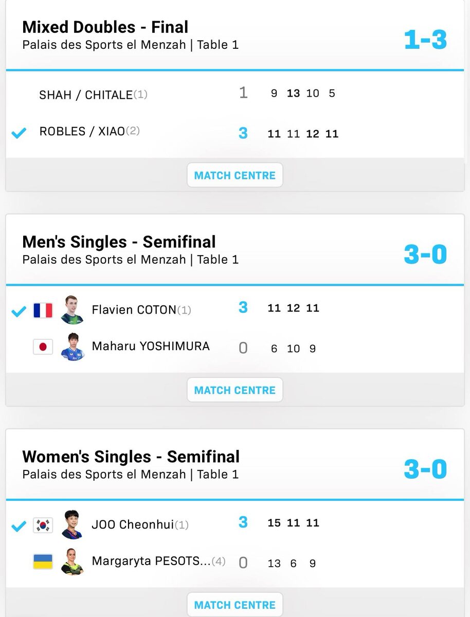 👁️ Полные результаты за день 5 и расписание на заключительный заход WTT Contender Tunis 2026