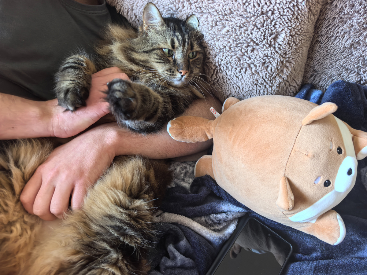 Утро началось очень рано. Сначала я пришёл в 6 часов просить паштетик у хозяйки. Она встала, покормила меня. А тут и хозяин решил проснуться. Хозяйка вернулась в постель и ещё немного поспала, а вот хозяин больше не спал. И мне это так понравилось!