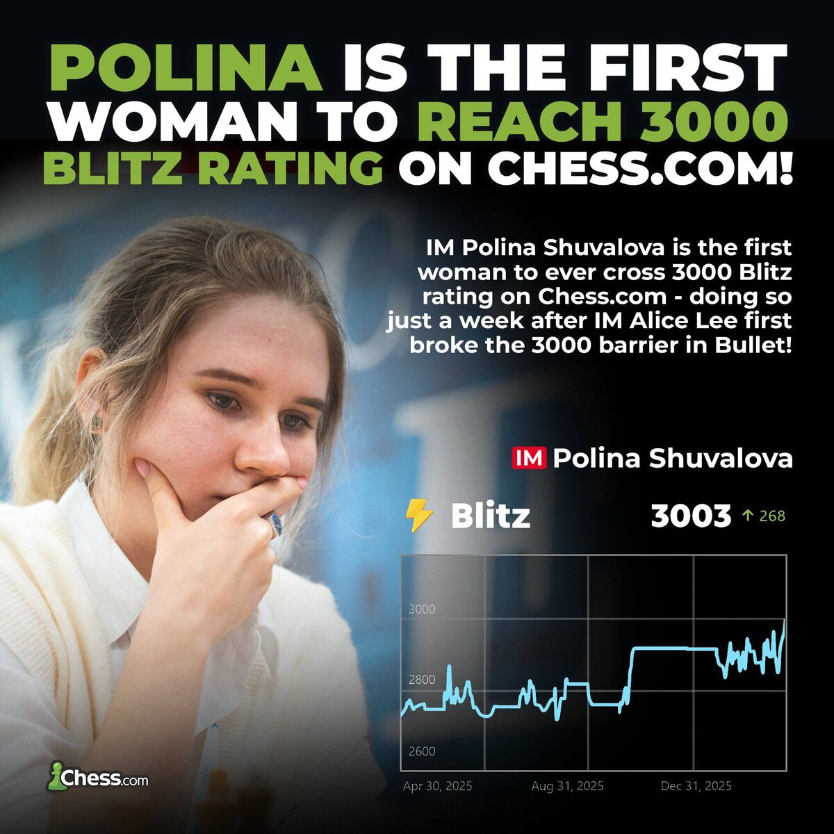 Многие шахматные ресурсы на днях сообщили о новом достижении Полины Шуваловой — она стала первой девушкой в истории, достигшей отметки 3000 в блице на Chess.com ♟️ За громкой цифрой — не только талант, но и ежедневная системная работа. Полина регулярно публикует отчёты о своём тренировочном процессе в Telegram, показывая, как выглядит путь к топ-уровню. 📊 В её ежедневных отчётах: Это наглядный пример того, что высокий результат в шахматах —