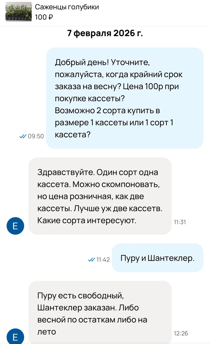 Я вообще заметила очень часто повторяющуюся закономерность - проблема прислать актуальные фото. Я прекрасно понимаю, что растения растут, меняются в течение сезона и в объявлении используются лучшие фото. Это нормально. Но перед покупкой покупатель имеет права заранее увидеть именно свой саженец/кассету/рассаду и т.д. Общий вид растения понятен, но когда растение становится товаром, покупатель должен видеть его заранее. Так что обращайте на это внимание, сомнительные продавцы начинают юлить в этот момент.