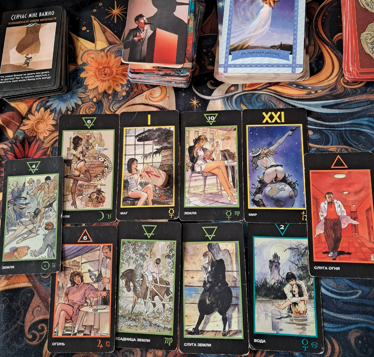 Это центральный крик его души: он хочет встретить свою пару, человека, с которым будет «на одной волне». Но в контексте остальных карт видно, что он идеализирует этот союз: он должен приносить ему и стабильность (10 Земли), и свободу творца (Маг), и признание (6 Огня), и возможность быть щедрым (6 Земли), и полную безопасность (Всадница и Слуга Земли).