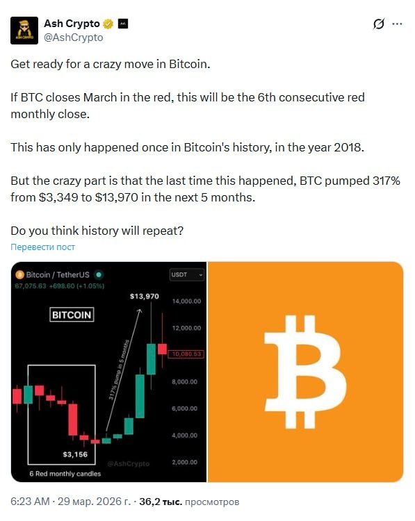 Если BTC закроет март в красной зоне, это будет шестое подряд месячное закрытие с падением