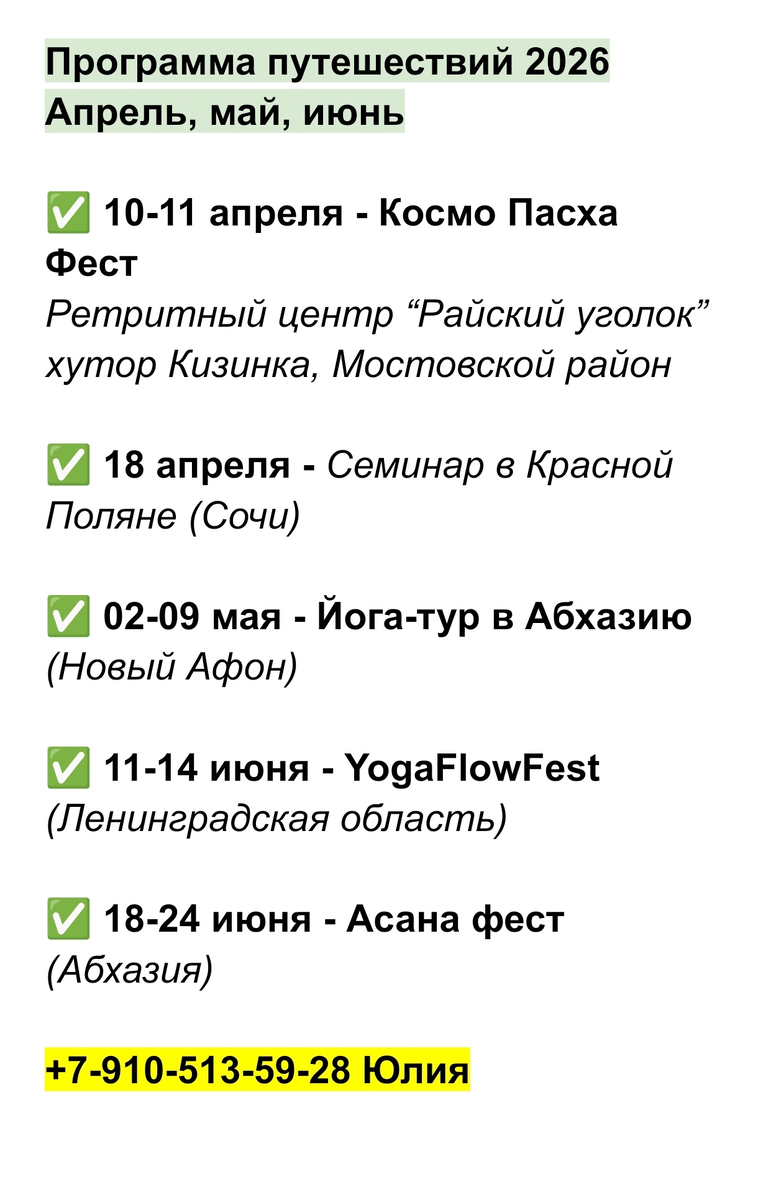Друзья, скоро начнется время отпусков и возможностей встретиться в живую. Самое время сообщить о своих передвижениях на сезон 26-го года. Здесь мой график до июня и контакт, по которому вы можете узнать подробности. Самый ближайший тур, где мы сможем встретиться - 2-9 мая в Абхазии! БРОНИРОВАНИЕ ОТКРЫТО В туре я даю очень глубоко принципы выполнения асан, даю основу, базу, которую вы сможете увезти с собой и пользоваться этими знаниями всю жизнь. В туре я могу отстроить и разобрать вашу личную практику, дать индивидуальные рекомендации и закрыть ваши вопросы. В туре достаточно времени, чтобы ответить на вопросы, которые не дают вам покоя, любые вопросы, даже не касающиеся йоги, но важные для вас, могут разрешиться прямо в туре! А ещё в турах мы много гуляем по горам, тропам и интересным историческим местам в сопровождении потрясающего гида-абхазоведа Татьяны Кузнецовой👍 Да, живое общение - это сильно, глубоко и гораздо эффективнее, чем онлайн. Для того, чтобы встретиться со мной, нужн