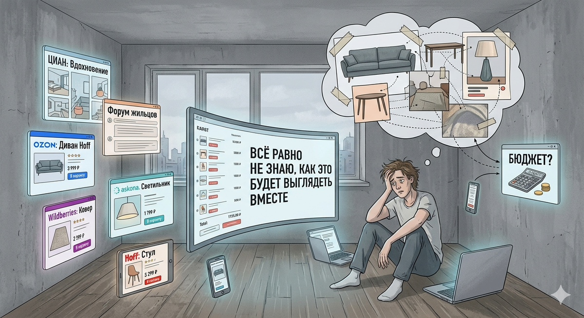 Если вы читали мои предыдущие статьи про инвестиции в недвижимость и хоумстейджинг — вы знаете, что я обставлял студию своими руками. Дважды. И оба раза это было мучительно. Схема каждый раз одна и та же. Стоишь в пустой комнате, смотришь на голые стены — и понимаешь, что не знаешь, с чего начать. Найти вдохновение помогают фото готовых вариантов из объявлений в ЦИАН или на форумах жильцов. Потом пытаешься найти конкретные вещи с этих фото на Wildberries, Ozon, в Hoff, Askona. Диван — на одном сайте, стол — на другом, светильник — вообще непонятно где, сравниваешь варианты и цены. Проходит несколько часов. У тебя открыты двадцать вкладок, полная корзина и ощущение, что ты ещё ничего не решил. А самое неприятное — ты всё равно не знаешь, как это будет выглядеть вместе. Диван из одного магазина, стол из другого, ковёр с третьего — в голове это как-то складывается, а в реальной комнате может оказаться полная каша. Плюс нужно уложиться в приемлемый бюджет, т.к. это инвестиции. Наверное, ес