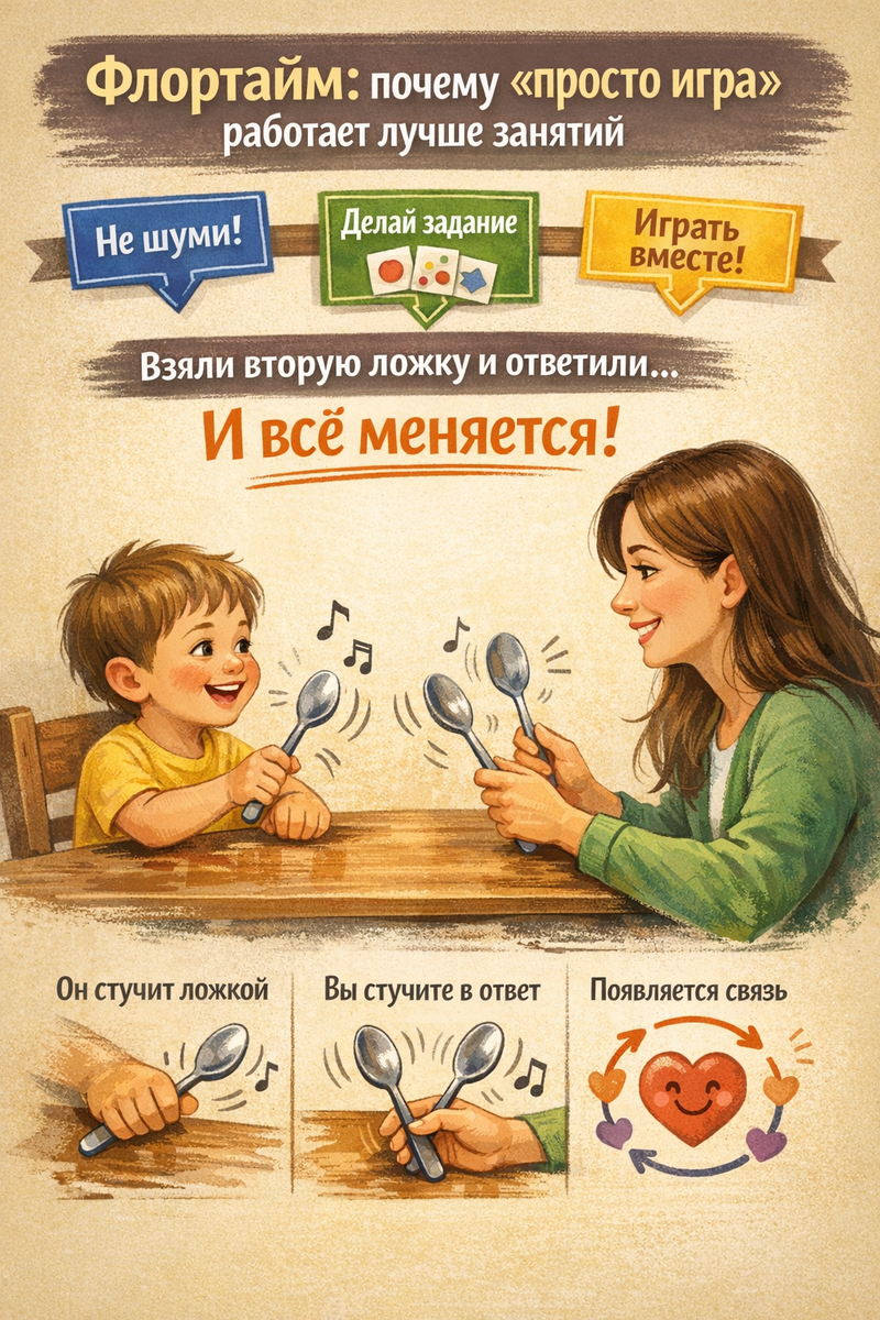 Утром на кухне: мама готовит завтрак, а ребёнок стучит ложкой по столу. Никакой методики». Никаких карточек. Просто звук, ритм, взгляд — и вдруг появляется диалог. Ложка — это барабан, стол — сцена, мама — зритель, который вдруг тоже начинает стучать. И вот уже есть игра.