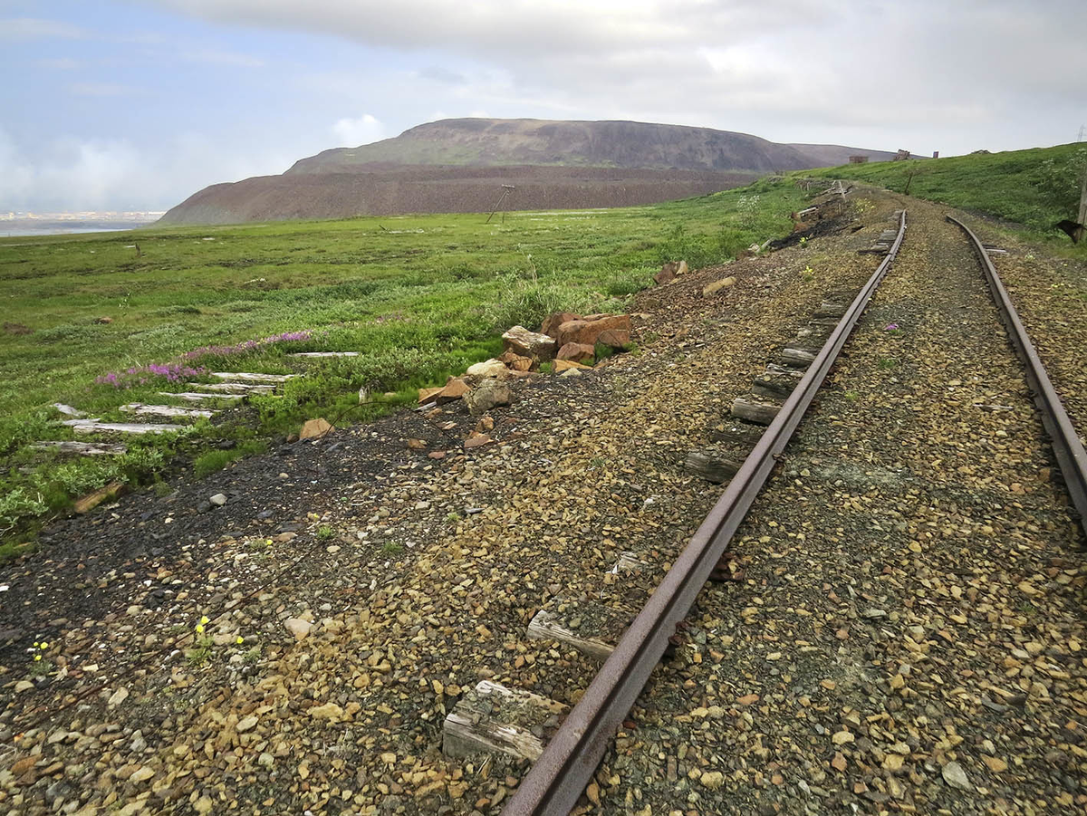 Над центром Норильска нависает гора Шмидтиха... а вот как она выглядит с обратной стороны. В прошлых частях мы взошли на неё со стороны центра и осмотрели заброшенный посёлок Западный за горой, а теперь осталось вернуться в город. Пути уходят вдаль - рельсы остались от ширококолейной железной дороги 1950-х годов, а шпалы справа видимо принадлежали шахтной узкоколейке. Обе они не видели поездов уже полвека - существенно дольше, чем действовали. По мере нашего движения по колее, Медный завод (построенный в начале 195-х) словно гигантский паровоз вытягивал из-за Шмидтихи город: Из его дыма же показался наконец Талнах - основанная в 1964 году на открытых тогда рудниках "улучшенная версия Норильска". На переднем плане же отлично видна наша цель - с тундр и мёртвых колей надо было как-то выйти на действующую железную дорогу: Это был самый долгий и скучный этап похода - по плоской тундре мы брели пару часов и даже перешли вброд небольшую речку: Вот и пути с руинами оборудования и невыносимо ч