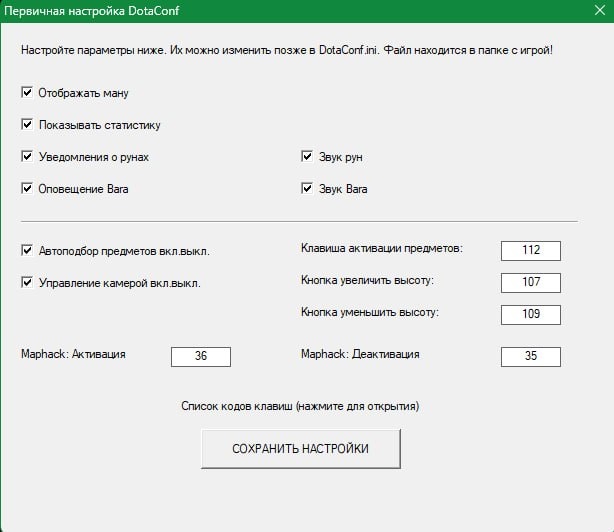 ! 🆕Появился первоначальный интерфейс для удобства быстрой настройки мап-хак конфига «DotaConf.ini»👀 ✅Один раз указали нужные вам галочки для настроек конфига «Full Map-Hack» и забыли!😱 Если хотите в дальнейшем "отключить или включить" дополнительные функции настроек мх,например статистику игроков в лобби игры,мана-бар,автоподбор,камерахак,звуки бары/рун,текстовые уведомления в игре рун/рошана или переназначить "кнопки клавиатуры", всё это можно отк/вкл или настроить под себя в файле конфига «DotaConf.ini» ⚙️Подробные настройки конфига «DotaConf.ini»: https://t.me/iccup_maphack_warcraftiii_dota/35084 🆕📌Кто желает из клиентов обновить «Full Map-Hack» пишите по контактам ниже: •@FalConMHDota •@Map_hack_iccup_warcraft3_dota •@maphack_iccup_warcraft3dota