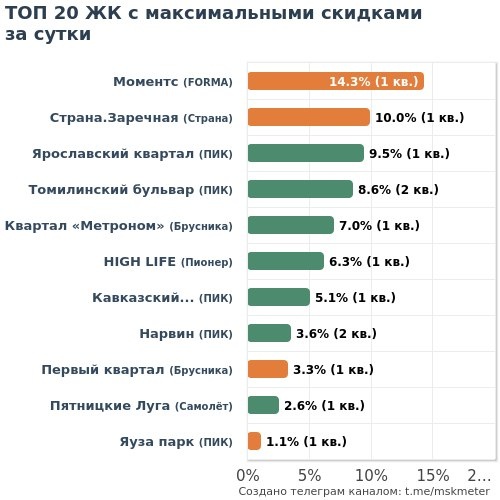 🟩 Честные скидки: 7 ЖК (9 кв.) 🟧 Маркетинг скидки: 4 ЖК (4 кв.) 💎 МАКСИМАЛЬНАЯ ЭКОНОМИЯ 🏆 ПИК • Ярославский квартал └🔻1.6M → 16.6M • 3-к 84м² 🥈 Брусника • Квартал «Метроном» └🔻1.4M → 19.9M • 1-к 43м² 🥉 ПИК • Кавказский бульвар 51 └🔻1.2M → 22.8M • 2-к 66м² 4️⃣ ПИК • Томилинский бульвар ├🔻781к → 9.1M • 1-к 35м² └🔻361к → 7.4M • Студия 20м²❗️ 5️⃣ ПИК • Нарвин ├🔻645к → 17.9M • 1-к 33м² └🔻585к → 17.8M • 1-к 33м² 6️⃣ Самолёт • Пятницкие Луга └🔻246к → 9.5M • 1-к 36м² ❗️— лоту меньше месяца 👇 Полная статистика: 📲 В Telegram | 🌐 На MskMeter.ru