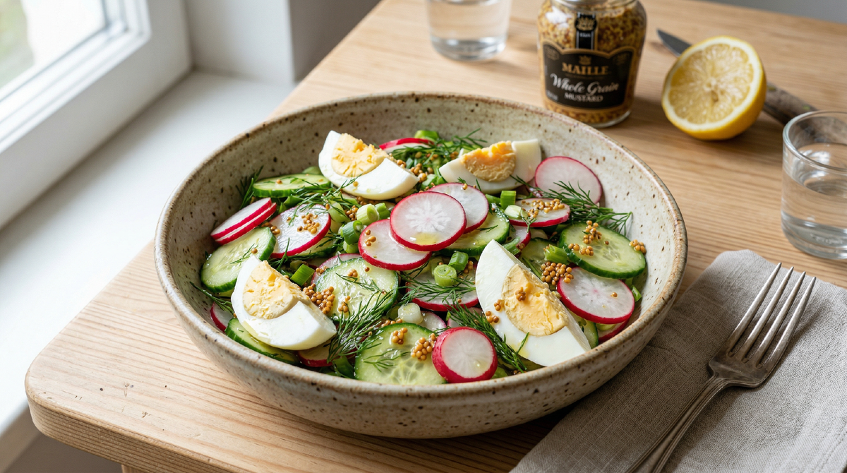 Каждый раз удивляюсь, как что-то настолько простое может быть настолько вкусным. В этом салате нет дорогих ингредиентов, нет сложных техник, нет ничего, чем можно было бы похвастаться перед гостями. Но именно эта простота и подкупает. Ты чувствуешь каждый продукт: хруст редиса, прохладу огурца, нежность яйца, остроту лука, аромат укропа. А горчица — как невидимый дирижёр — собирает весь этот маленький оркестр в единую мелодию.