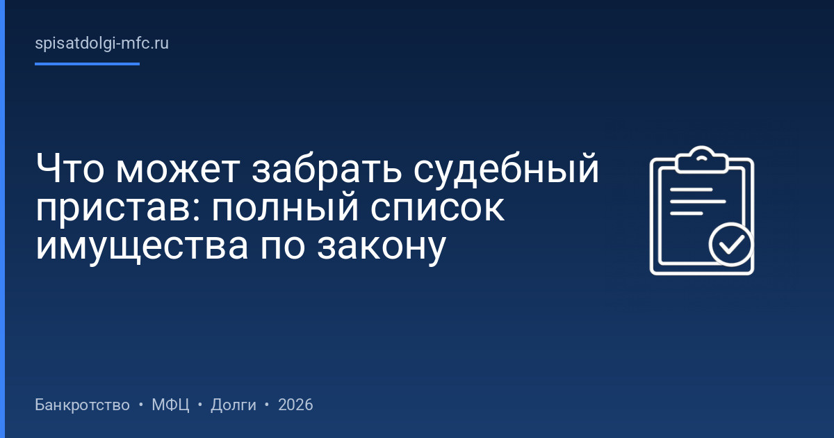 Когда долги становятся неподъемными, многие должники сталкиваются с исполнительным производством. Судебные приставы получают право изымать имущество для погашения задолженности, но не все подряд. Закон четко определяет, что можно забрать, а что остается неприкосновенным. Судебный пристав имеет право наложить арест и реализовать любое имущество должника, не входящее в список исключений. В первую очередь взыскание обращается на денежные средства и ценности. К имуществу, подлежащему изъятию, относятся: Приставы также могут арестовать заработную плату, удерживая до 50% от суммы после вычета подоходного налога. В особых случаях размер удержания может достигать 70%. Федеральный закон «Об исполнительном производстве» защищает жизненно важное имущество граждан от взыскания. Эти ограничения действуют независимо от размера долга. Под защитой закона находятся: Важное исключение касается единственного жилья: его могут изъять, если оно приобретено за счет кредитных средств и является предметом зало