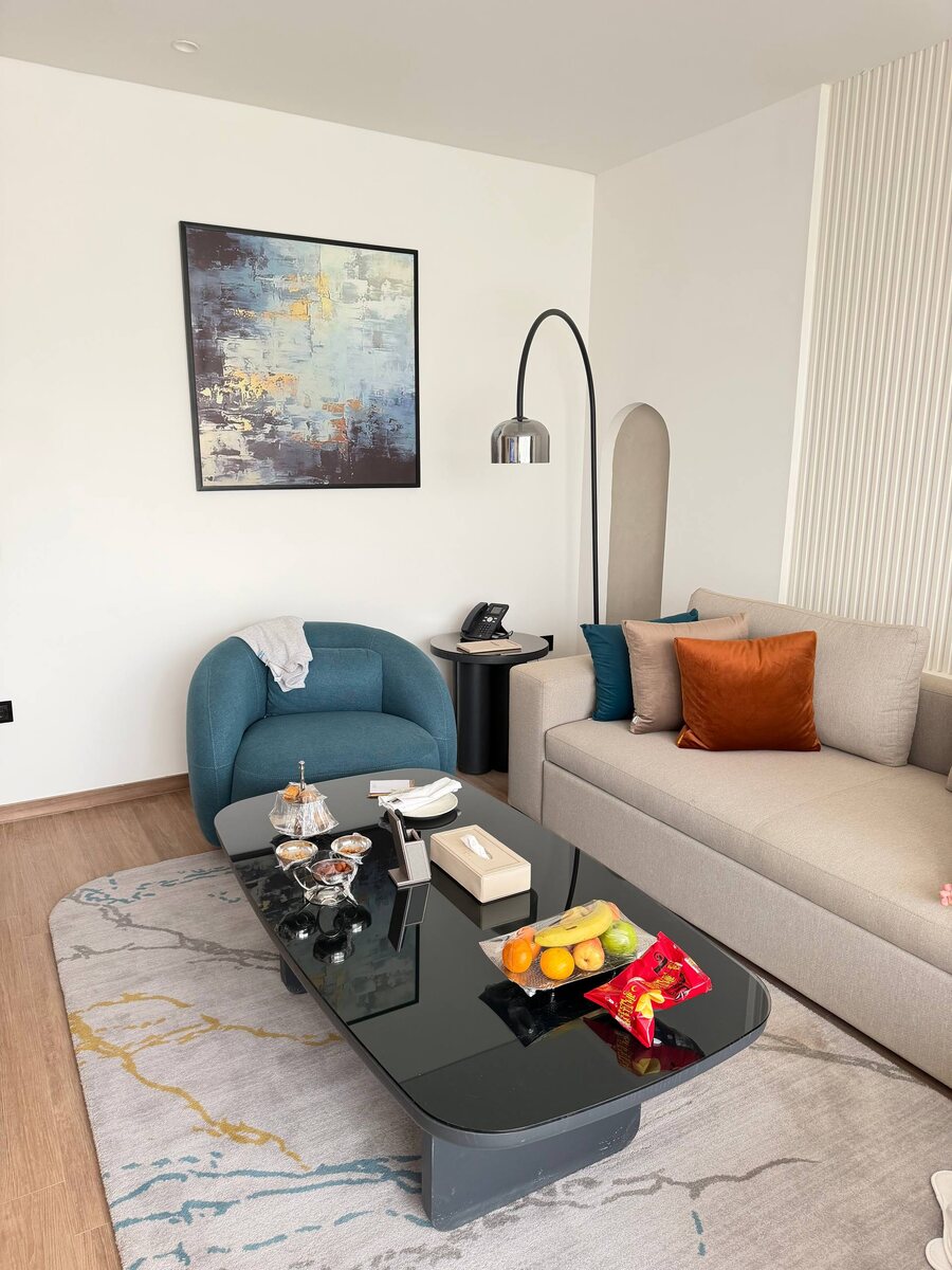 Номера отличные! Свежий ремонт, белоснежное белье, белоснежные полотенца, на троих 15 штук, система Умный дом, открывающая шторы и изменяющая освещение. Просторный санузел с косметикой известного итальянца Roberto Cavalli и просторный диван, из которого трансформируется дополнительное спальное место для ребенка.