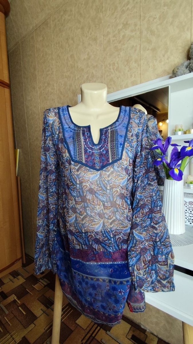 В продаже лёгкая, полупрозрачная блузка, в стиле Бохо, от североамериканского бренда Edc. Сделана из тончайшего шифона, нежная, лёгкая, прекрасное дополнение к купальнику, либо можно одевать , поддев под неё топ. С длинным прямым рукавом, сама блузка к низу слегка расклёшенная. В идеальном состоянии. Размер S 42 -44 Длина - 79 см ПОГ - 47 см Длина рукава -62 см Ширина рукава - 16 см Цена 500 рублей ЦЕНА 300 РУБЛЕЙ+ пересылка