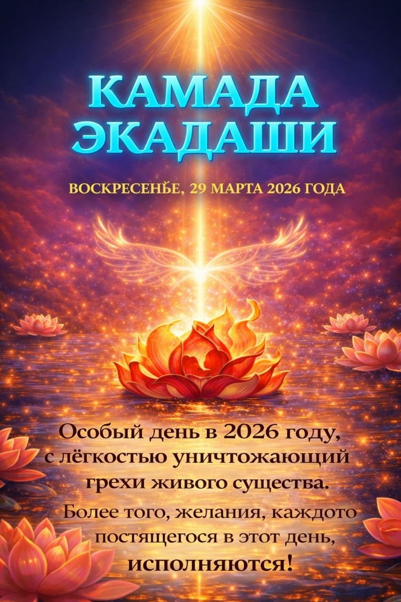 ✨ 📅 Мои дорогие, сегодня 29 марта 2026 года — священный день Камада Экадаши 🌙 — один из особенно благоприятных дней ведического календаря. Название «Камада» переводится как «исполняющий желания». Этот Экадаши считается временем, когда искренние намерения человека могут получить поддержку Высших сил, а соблюдение поста приносит очищение и исполнение сокровенных желаний 🌟 Поэтому Камада Экадаши особенно благоприятен для тех, кто: ✨ хочет исполнить важное желание 🌿 стремится очистить карму 💫 ищет поддержку в новых начинаниях 🙏 готов соединиться с Божественной энергией через практику Начало поста: после Брахма мухурты 29 марта Паран (выход из поста): 30 марта (после Брахма мухурты) 🌿 Соблюдение поста в Камада Экадаши даёт: • 🌱 Очищение кармы и освобождение от накопленных последствий прошлых поступков • ✨ Исполнение искренних и благих желаний • 🕉 Благословение Господа Вишну на процветание и гармонию судьбы • 💚 Гармонизацию внутреннего состояния и укрепление веры • 🌸 Усиление