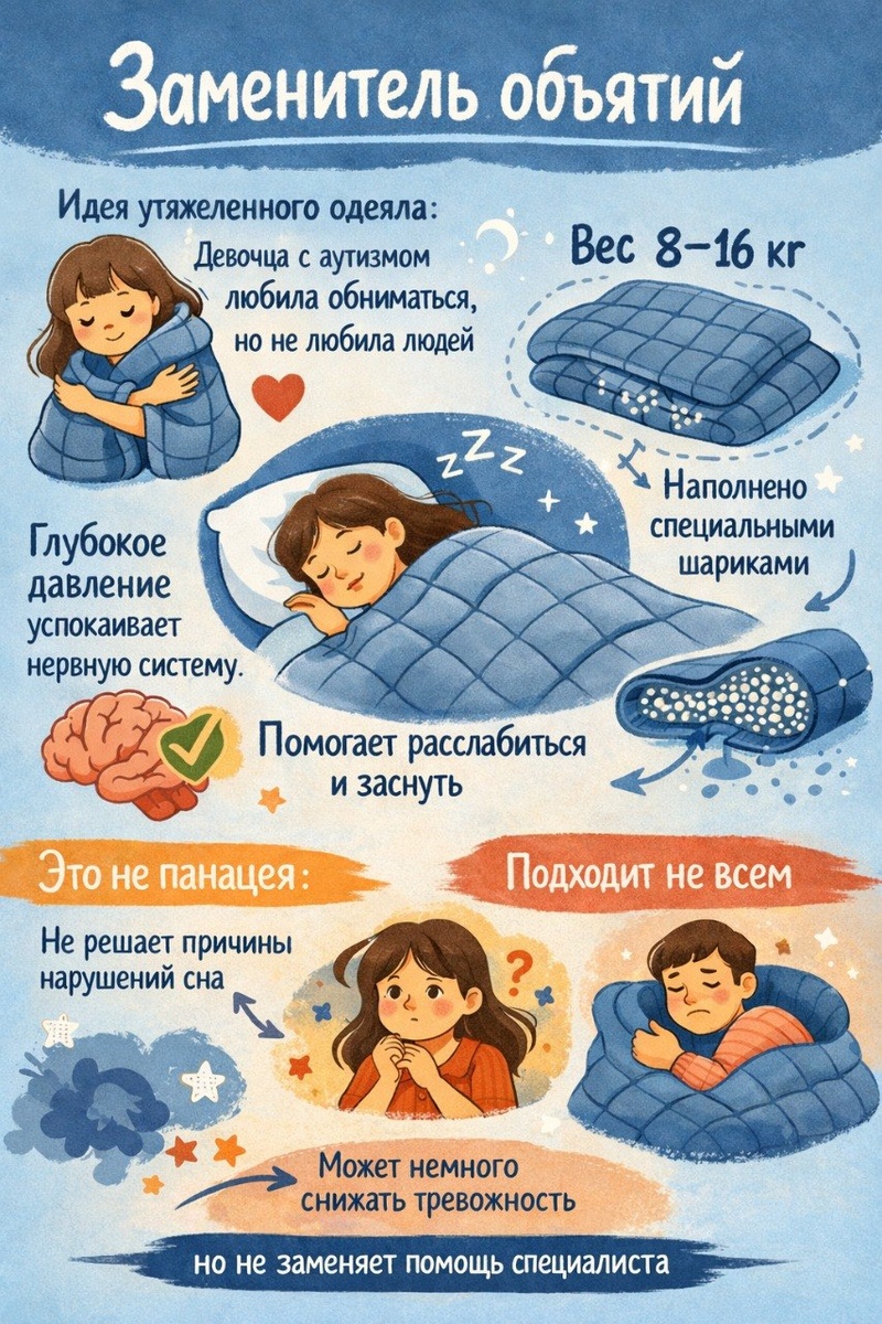 Есть популярная история, что утяжеленное одеяло придумала девочка с аутизмом, которая любила обниматься, но не любила людей. Такие одеяла действительно начали использовать в работе с людьми с сенсорными особенностями. Врачи заметили, что у некоторых подопечных есть потребность в давлении на тело — например, в плотных объятиях. Это приводило к значительному успокоению нервной системы. Утяжеленное одеяло работает примерно так: равномерное давление на тело может снижать уровень возбуждения и давать ощущение спокойствия. Поэтому части людей под таким одеялом действительно легче расслабиться и заснуть. Вес утяжелённого одеяла обычно 8–16 кг. Это не просто кусок ткани, набитый ватой, а полотно, прошитое вдоль и поперек специальными шариками, придающими вес. Но важно понимать: это не универсальный инструмент. Оно может немного снижать тревожность и облегчать засыпание, но не решает причины нарушений сна и подходит далеко не всем. Интересно, пробовали ли вы такие одеяла и был ли эффект?