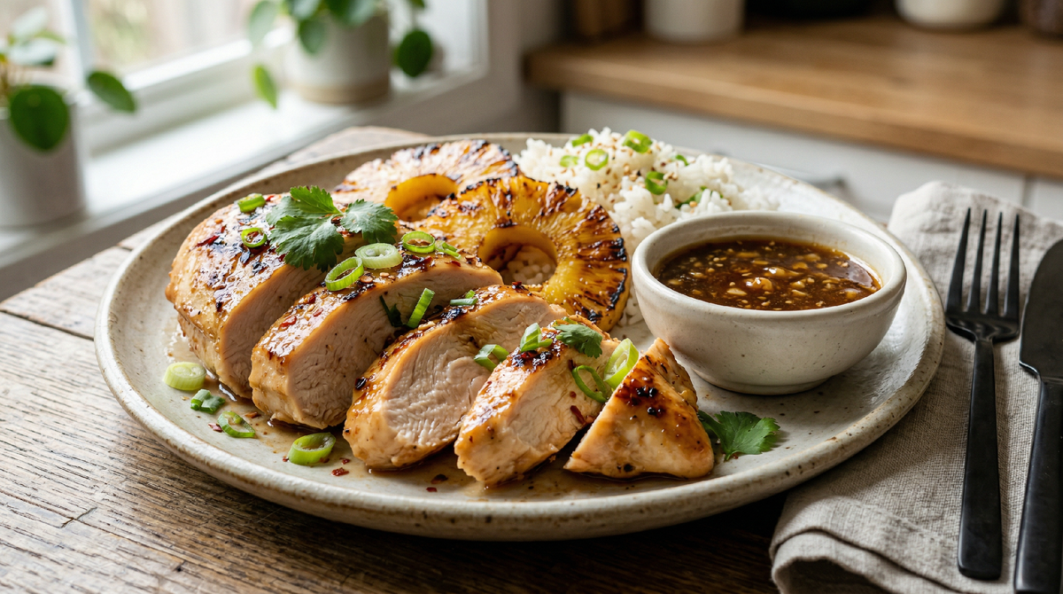 Вам понадобится два крупных филе куриной грудки, это примерно пятьсот-шестьсот граммов. Стакан свежевыжатого ананасового сока — это один средний ананас или около двухсот пятидесяти миллилитров сока. Две столовые ложки соевого соуса, лучше взять классический, не слишком солёный. Три-четыре зубчика чеснока. Небольшой кусочек свежего корня имбиря — примерно два сантиметра, хотя если имбирь вы не любите, его можно пропустить. Столовая ложка растительного масла для маринада и ещё пара ложек для жарки. Чайная ложка мёда. Соль и чёрный молотый перец по вкусу. Для подачи хорошо подойдут несколько колец свежего ананаса и веточка зелени, но это уже по желанию.