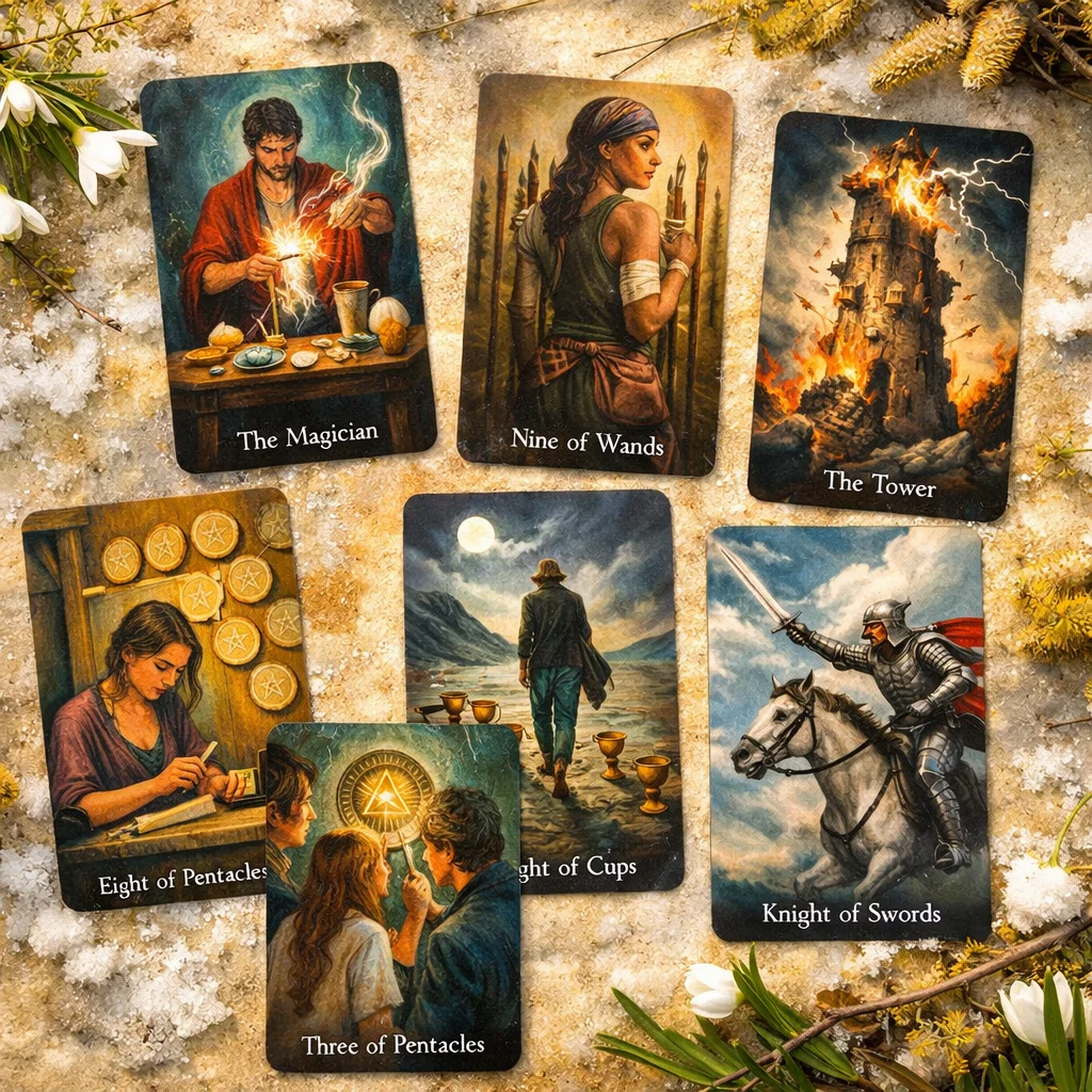 Спасибо каждому за лайки, подписки, комментарии, донаты! 🙏❤️ Вы вдохновляете меня создавать новые расклады и делиться важными посланиями. Пусть всё добро возвращается к вам сторицей! 💖 Мои дорогие, сегодня будет расклад не про «ой, он соскучился и бежит с цветами». Сейчас будет про правду. Про ту правду, которую обычно не хотят слышать, но именно она потом спасает от повторения одних и тех же граблей. Потому что вопрос «что он наконец-то сделает» — это уже крик души. Это когда вы устали ждать, устали тянуть, устали быть той, кто держит всё на себе. И карты здесь не гладкие — они дерзкие, как вы внутри на самом деле. Карты расклада: Маг, Восьмёрка Пентаклей, Девятка Жезлов, Восьмёрка Кубков, Рыцарь Мечей, Тройка Пентаклей, Башня. Начнём с того, что между вами уже не «конфетно-букетный», а уставший, выжженный этап. Девятка Жезлов — это когда ещё держитесь, но уже на последнем ресурсе. Это не пауза из серии «давай подумаем», это пауза, где душа говорит: «ещё немного — и я просто выйду и